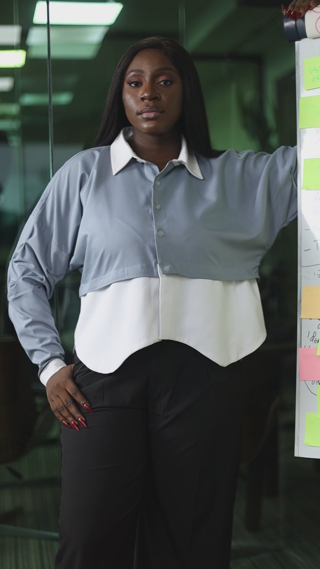 Design Details: Layered two-tone shirt effect with a crisp contrast collar and curved hemline. Button down front, relaxed long sleeves, and tailored wide-leg trousers with side pockets.
